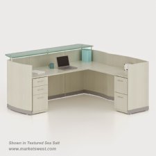 Medina Series L-Shape Reception Station, with BBF, FF". Available in 5 Laminate Finishes: Gray Steel, Mahogany, Mocha, Textured Brown Sugar, and Textured Sea Salt.