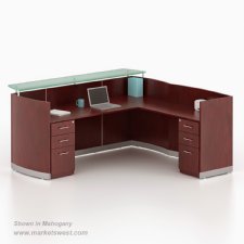 Medina Series L-Shape Reception Station, with 2 BBF Pedestals. Available in 5 Laminate Finishes: Gray Steel, Mahogany, Mocha, Textured Brown Sugar, and Textured Sea Salt.